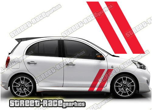 Nissan Micra racing stripes sticker kit from street-race.org. These stripes are a universal fit so they will fit all Nissan Micra cars and facelift variants. They are not pre-cut around the doors or wheel arches so will suit both 2 and 4 door cars.