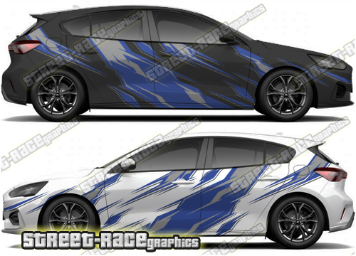 Ford Focus large side rally graphics sticker kit from street race graphics. This will fit all versions of the Ford Focus. Trimming is required around wheel arches and door handles.