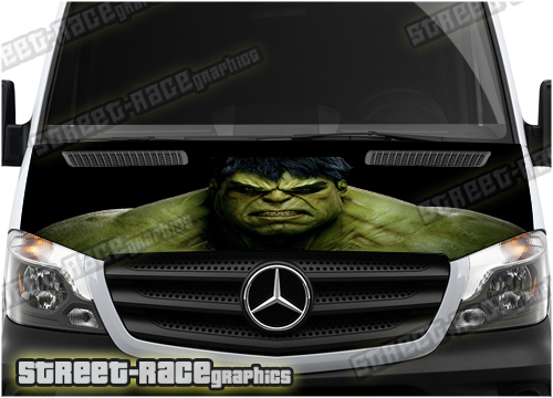 Hulk digitally printed vinyl bonnet / hood wrap. There are no gaps or clear areas in this bonnet graphic, so it can be fitted to any colour van.