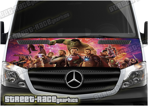 Avengers digitally printed vinyl bonnet / hood wrap. There are no gaps or clear areas in this bonnet graphic, so it can be fitted to any colour van.