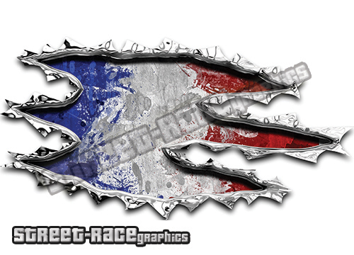 A digitally printed ripped torn metal effect vinyl sticker from street-race graphics. These graphics are printed using a high specification vinyl inkjet printer, using long-life inks and outdoor-use top quality vinyl. The sticker is then laminated and contour cut around the perimeter of the jagged metal effect.
