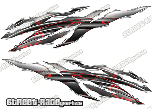 A digitally printed ripped torn metal effect vinyl sticker from street-race graphics. These graphics are printed using a high specification vinyl inkjet printer, using long-life inks and outdoor-use top quality vinyl. The sticker is then laminated and contour cut around the perimeter of the jagged metal effect.