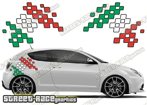 - 2 x Italian flag style side decals, one for each side of the car.