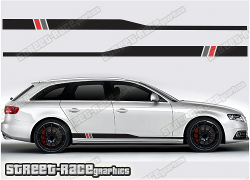 Audi A4 side racing stripe graphics, to suit all Audi A4 cars. Available in a range of different colour combinations.