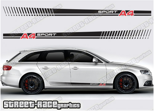Audi A4 side racing stripe graphics, to suit all Audi A4 cars. Available in a range of different colour combinations.