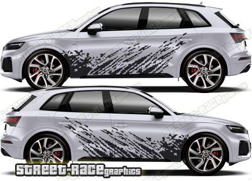 Audi Q5 graphics. They are shown on the first generation Audi Q5. The decals are universal fit: they are not pre-cut for any specific Q5 so they will be suitable for any facelift variants. They do not have any door handle cutouts, wheel arch or door line splits. These will require trimming during fitting.