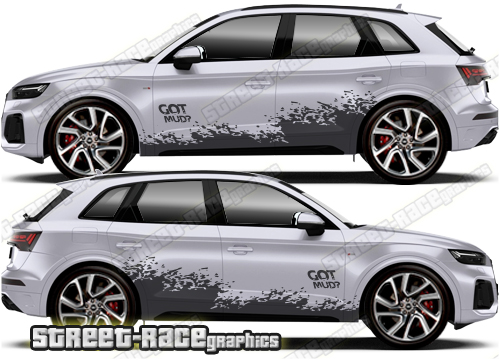 Audi Q5 graphics. They are shown on the first generation Audi Q5. The decals are universal fit: they are not pre-cut for any specific Q5 so they will be suitable for any facelift variants. They do not have any door handle cutouts, wheel arch or door line splits. These will require trimming during fitting.