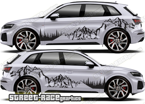 Audi Q5 graphics. They are shown on the first generation Audi Q5. The decals are universal fit: they are not pre-cut for any specific Q5 so they will be suitable for any facelift variants. They do not have any door handle cutouts, wheel arch or door line splits. These will require trimming during fitting.