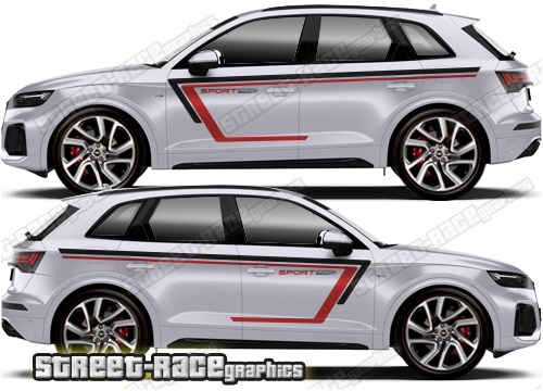 Audi Q5 graphics. They are shown on the first generation Audi Q5. The decals are universal fit: they are not pre-cut for any specific Q5 so they will be suitable for any facelift variants. They do not have any door handle cutouts, wheel arch or door line splits. These will require trimming during fitting.