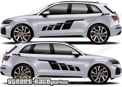 Audi Q5 graphics. They are shown on the first generation Audi Q5. The decals are universal fit: they are not pre-cut for any specific Q5 so they will be suitable for any facelift variants. They do not have any door handle cutouts, wheel arch or door line splits. These will require trimming during fitting.