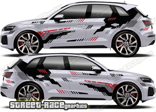 Audi Q5 graphics. They are shown on the first generation Audi Q5. The decals are universal fit: they are not pre-cut for any specific Q5 so they will be suitable for any facelift variants. They do not have any door handle cutouts, wheel arch or door line splits. These will require trimming during fitting.