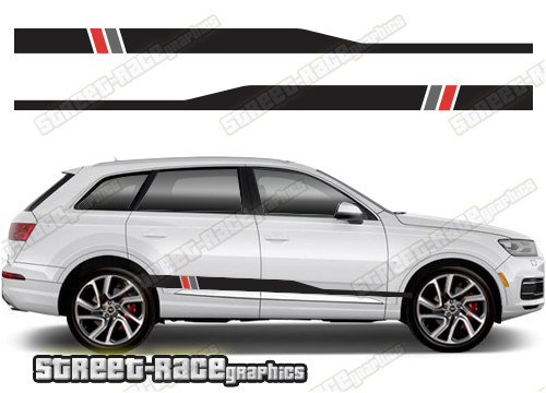 Audi Q7 racing stripes. They are shown on the 2020 Audi Q7. The decals are universal fit: they are not pre-cut for any specific Q7 so they will be suitable for any facelift variants. They do not have any wheel arch cutouts or door line splits. These will require trimming during fitting.