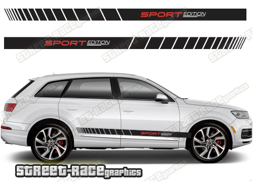 Audi Q7 racing stripes. They are shown on the 2020 Audi Q7. The decals are universal fit: they are not pre-cut for any specific Q7 so they will be suitable for any facelift variants. They do not have any wheel arch cutouts or door line splits. These will require trimming during fitting.