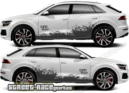 Audi Q8 graphics. They are shown on the 2020 Audi. The decals are universal fit: they are not pre-cut for any specific Q8 so they will be suitable for any facelift variants. They do not have any door handle cutouts, wheel arch or door line splits. These will require trimming during fitting.
