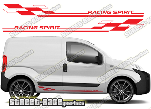 Peugeot Bipper racing stripes. They are a universal fit to suit all Peugeot Bipper vans and facelift variants. There are no cutouts for the wheel arches or door lines, these will require trimming during fitting.