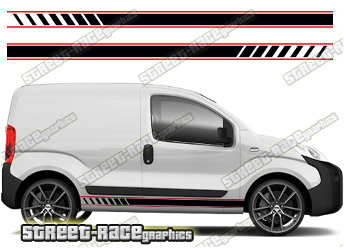 Peugeot Bipper racing stripes. They are a universal fit to suit all Peugeot Bipper vans and facelift variants. There are no cutouts for the wheel arches or door lines, these will require trimming during fitting.
