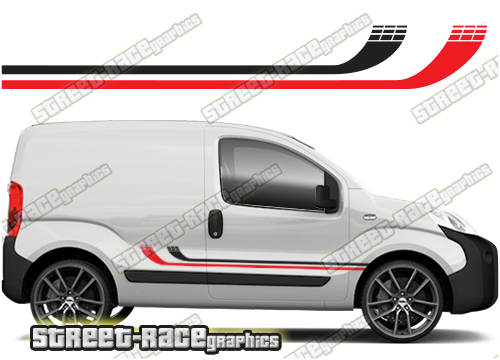 Peugeot Bipper racing stripes. They are a universal fit to suit all Peugeot Bipper vans and facelift variants. There are no cutouts for the wheel arches or door lines, these will require trimming during fitting.