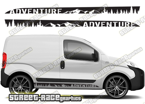 Peugeot Bipper Mountain Adventure graphics. They are a universal fit to suit all Peugeot Bipper vans and facelift variants. There are no cutouts for the wheel arches or door lines, these will require trimming during fitting.