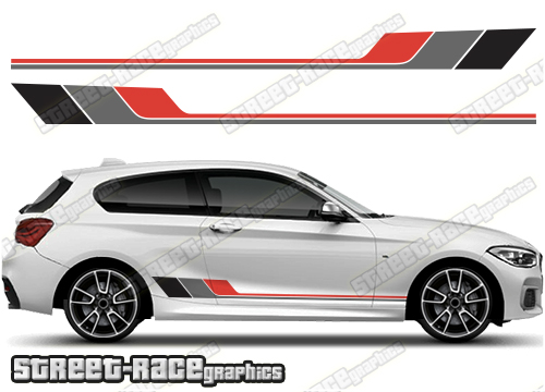BMW 1 series side racing stripe graphics, to suit all BMW 1 series cars and facelift variants. Available in a range of different colour combinations.
