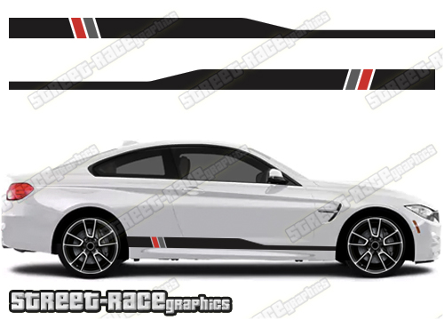 BMW 3 series side racing stripe graphics, to suit all BMW 3 series cars and facelift variants. Available in a range of different colour combinations.
