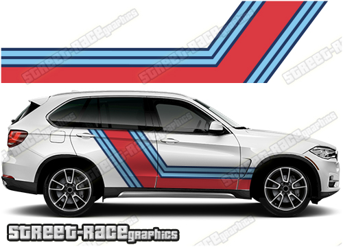 BMW X5 Martini style lower side racing stripe digitally printed graphics. There are no gaps or clear areas in these graphics, so this graphic can be fitted to any colour car.