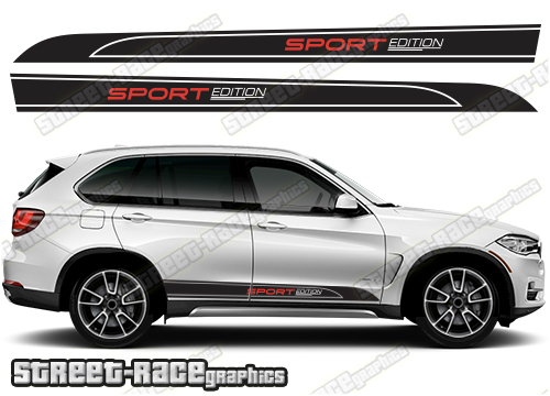 BMW X5 side racing stripe graphics, to suit all BMW X5 cars and facelift variants. Available in a range of different colour combinations.