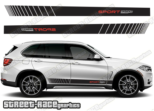 BMW X5 side racing stripe graphics, to suit all BMW X5 cars and facelift variants. Available in a range of different colour combinations.