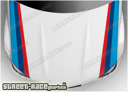 BMW M-Series (M Power / M Sport) bonnet / hood racing stripe graphics, digitally printed. There are no gaps or clear areas in these racing stripes, so they can be fitted to any colour car.
