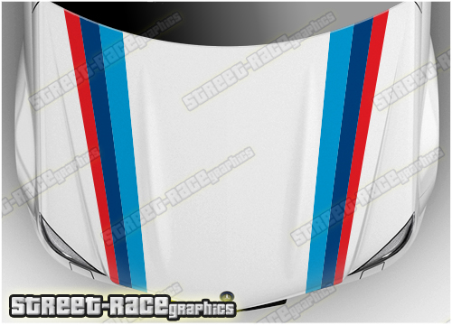 BMW M-Series (M Power / M Sport) bonnet / hood racing stripe graphics, digitally printed. There are no gaps or clear areas in these racing stripes, so they can be fitted to any colour car.