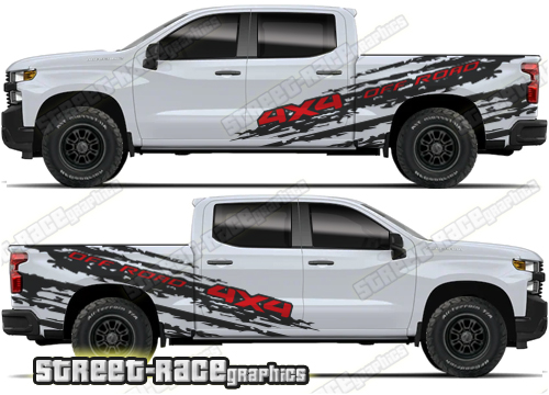 Chevrolet Silverado large graphics. They are shown on the 4th generation dual cab 1500 Silverado, but they can be made / trimmed fit all earlier versions and facelift variants. The decals do not have any door handle cutouts, wheel arch or door line splits. These will require trimming during fitting. Vinyl will not stick to unpainted textured plastics.
