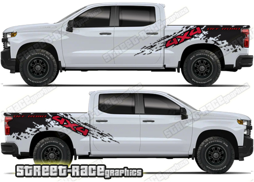 Chevrolet Silverado large graphics. They are shown on the 4th generation dual cab 1500 Silverado, but they can be made / trimmed fit all earlier versions and facelift variants. The decals do not have any door handle cutouts, wheel arch or door line splits. These will require trimming during fitting. Vinyl will not stick to unpainted textured plastics.