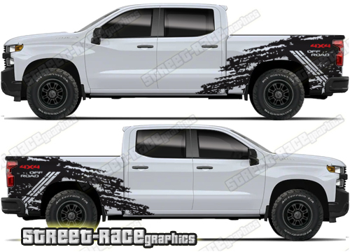 Chevrolet Silverado large graphics. They are shown on the 4th generation dual cab 1500 Silverado, but they can be made / trimmed fit all earlier versions and facelift variants. The decals do not have any door handle cutouts, wheel arch or door line splits. These will require trimming during fitting. Vinyl will not stick to unpainted textured plastics.