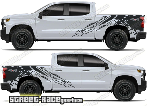Chevrolet Silverado large graphics. They are shown on the 4th generation dual cab 1500 Silverado, but they can be made / trimmed fit all earlier versions and facelift variants. The decals do not have any door handle cutouts, wheel arch or door line splits. These will require trimming during fitting. Vinyl will not stick to unpainted textured plastics.