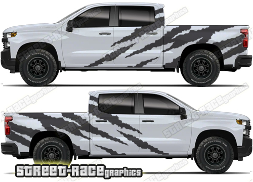 Chevrolet Silverado large graphics. They are shown on the 4th generation dual cab 1500 Silverado, but they can be made / trimmed fit all earlier versions and facelift variants. The decals do not have any door handle cutouts, wheel arch or door line splits. These will require trimming during fitting. Vinyl will not stick to unpainted textured plastics.