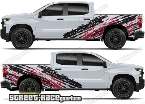 Chevrolet Silverado large graphics. They are shown on the 4th generation dual cab 1500 Silverado, but they can be made / trimmed fit all earlier versions and facelift variants. The decals do not have any door handle cutouts, wheel arch or door line splits. These will require trimming during fitting. Vinyl will not stick to unpainted textured plastics.