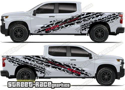 Chevrolet Silverado large graphics. They are shown on the 4th generation dual cab 1500 Silverado, but they can be made / trimmed fit all earlier versions and facelift variants. The decals do not have any door handle cutouts, wheel arch or door line splits. These will require trimming during fitting. Vinyl will not stick to unpainted textured plastics.