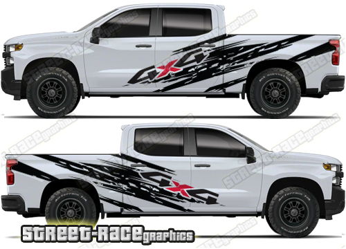 Chevrolet Silverado large graphics. They are shown on the 4th generation dual cab 1500 Silverado, but they can be made / trimmed fit all earlier versions and facelift variants. The decals do not have any door handle cutouts, wheel arch or door line splits. These will require trimming during fitting. Vinyl will not stick to unpainted textured plastics.