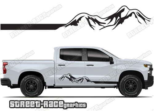Chevrolet Silverado racing stripes. They are shown on the 4th generation dual cab 1500 Silverado, but they can be made / trimmed fit all earlier versions and facelift variants. The decals do not have any door handle cutouts, wheel arch or door line splits. These will require trimming during fitting. Vinyl will not stick to unpainted textured plastics.