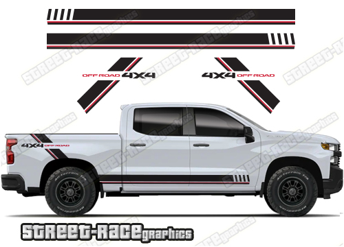 Chevrolet Silverado racing stripes. They are shown on the 4th generation dual cab 1500 Silverado, but they can be made / trimmed fit all earlier versions and facelift variants. The decals do not have any door handle cutouts, wheel arch or door line splits. These will require trimming during fitting. Vinyl will not stick to unpainted textured plastics.