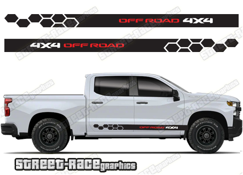 Chevrolet Silverado racing stripes. They are shown on the 4th generation dual cab 1500 Silverado, but they can be made / trimmed fit all earlier versions and facelift variants. The decals do not have any door handle cutouts, wheel arch or door line splits. These will require trimming during fitting. Vinyl will not stick to unpainted textured plastics.