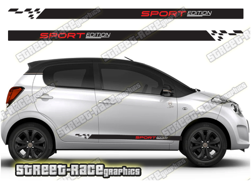 Citroen C1 racing stripes. They are a universal fit to suit all Citroen C1 cars and facelift variants from MK1 onwards. There are no cutouts for the wheel arches or door lines; these will require trimming during fitting.