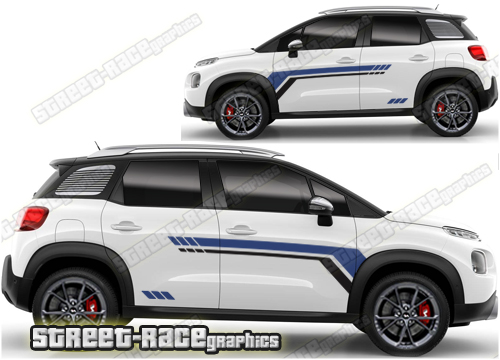 Citroen C3 Aircross graphics. They are shown on the first generation C3 Aircross but they can be trimmed to fit all later versions and facelift variants. The decals are not pre-cut for any specific Citroen C3 Aircross version; they do not have any door handle cutouts, wheel arch or door line splits. These will require trimming during fitting. Vinyl will not stick to unpainted textured plastics.