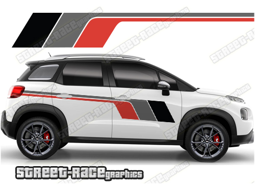 Citroen C3 Aircross racing stripes. They are shown on the first generation C3 Aircross but they can be trimmed to fit all later versions and facelift variants. The decals are not pre-cut for any specific Citroen C3 Aircross version; they do not have any door handle cutouts, wheel arch or door line splits. These will require trimming during fitting. Vinyl will not stick to unpainted textured plastics.