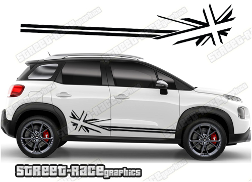 Citroen C3 Aircross racing stripes. They are shown on the first generation C3 Aircross but they can be trimmed to fit all later versions and facelift variants. The decals are not pre-cut for any specific Citroen C3 Aircross version; they do not have any door handle cutouts, wheel arch or door line splits. These will require trimming during fitting. Vinyl will not stick to unpainted textured plastics.