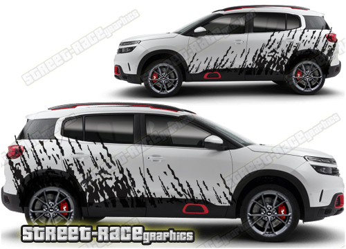 Citroen C5 Aircross graphics. They are shown on the first generation C5 Aircross but they can be trimmed to fit all later versions and facelift variants. The decals are not pre-cut for any specific Citroen C5 Aircross version; they do not have any door handle cutouts, wheel arch or door line splits. These will require trimming during fitting. Vinyl will not stick to unpainted textured plastics.