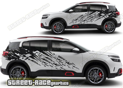 Citroen C5 Aircross graphics. They are shown on the first generation C5 Aircross but they can be trimmed to fit all later versions and facelift variants. The decals are not pre-cut for any specific Citroen C5 Aircross version; they do not have any door handle cutouts, wheel arch or door line splits. These will require trimming during fitting. Vinyl will not stick to unpainted textured plastics.