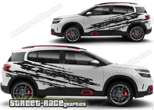 Citroen C5 Aircross graphics. They are shown on the first generation C5 Aircross but they can be trimmed to fit all later versions and facelift variants. The decals are not pre-cut for any specific Citroen C5 Aircross version; they do not have any door handle cutouts, wheel arch or door line splits. These will require trimming during fitting. Vinyl will not stick to unpainted textured plastics.