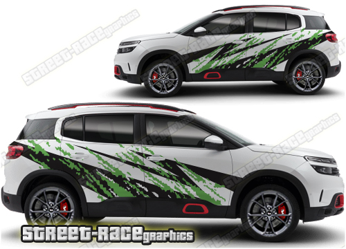 Citroen C5 Aircross graphics. They are shown on the first generation C5 Aircross but they can be trimmed to fit all later versions and facelift variants. The decals are not pre-cut for any specific Citroen C5 Aircross version; they do not have any door handle cutouts, wheel arch or door line splits. These will require trimming during fitting. Vinyl will not stick to unpainted textured plastics.