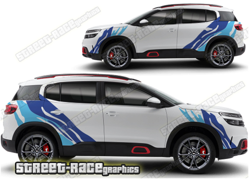 Citroen C5 Aircross graphics. They are shown on the first generation C5 Aircross but they can be trimmed to fit all later versions and facelift variants. The decals are not pre-cut for any specific Citroen C5 Aircross version; they do not have any door handle cutouts, wheel arch or door line splits. These will require trimming during fitting. Vinyl will not stick to unpainted textured plastics.