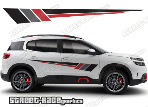 Citroen C5 Aircross racing stripes. They are shown on the first generation C5 Aircross but they can be trimmed to fit all later versions and facelift variants. The decals are not pre-cut for any specific Citroen C5 Aircross version; they do not have any door handle cutouts, wheel arch or door line splits. These will require trimming during fitting. Vinyl will not stick to unpainted textured plastics.